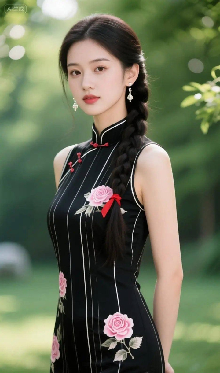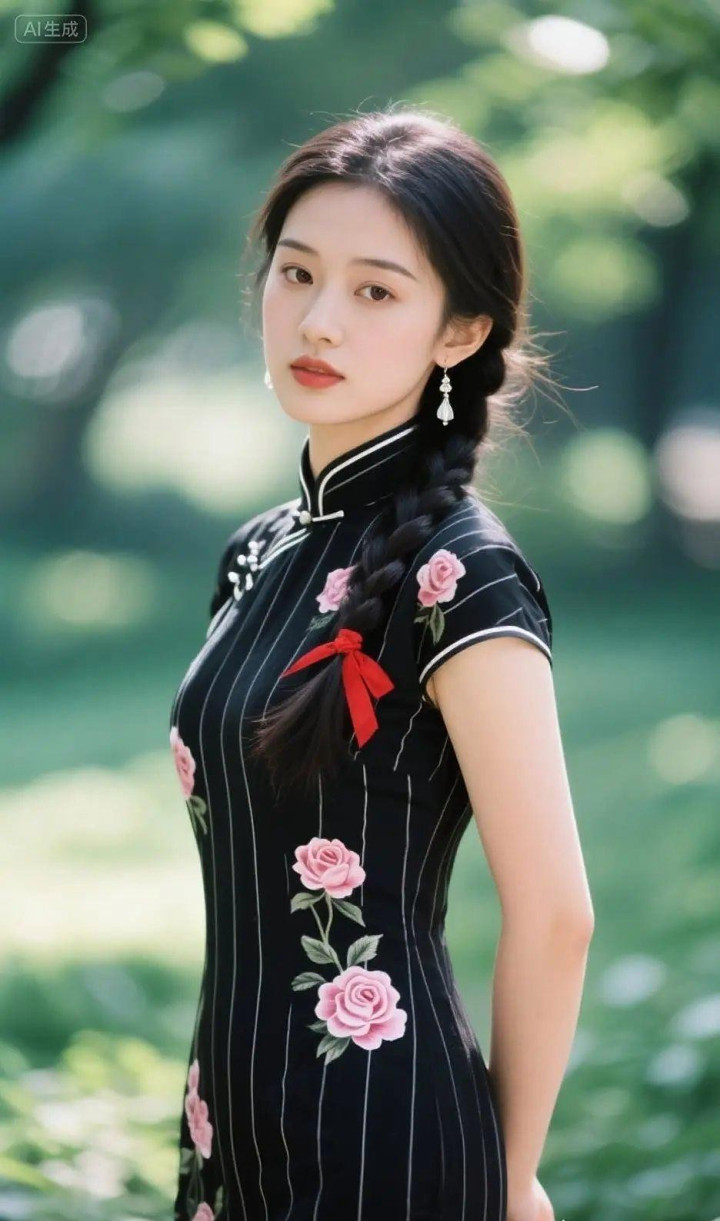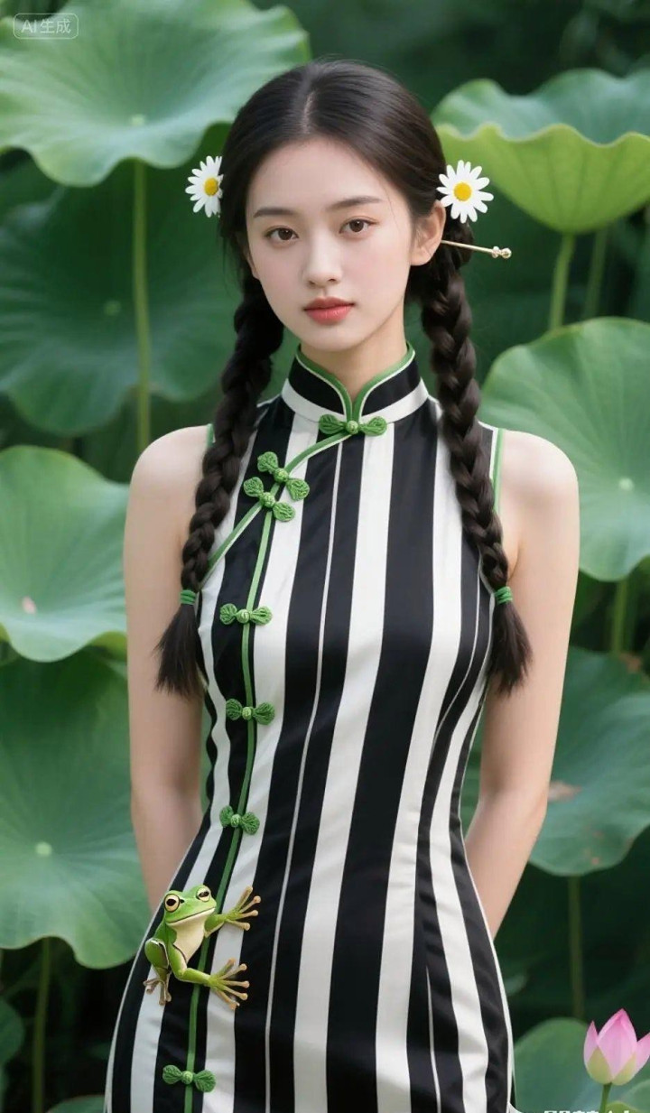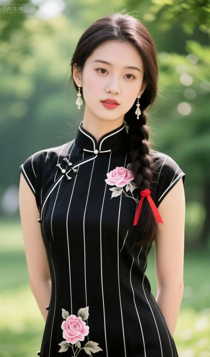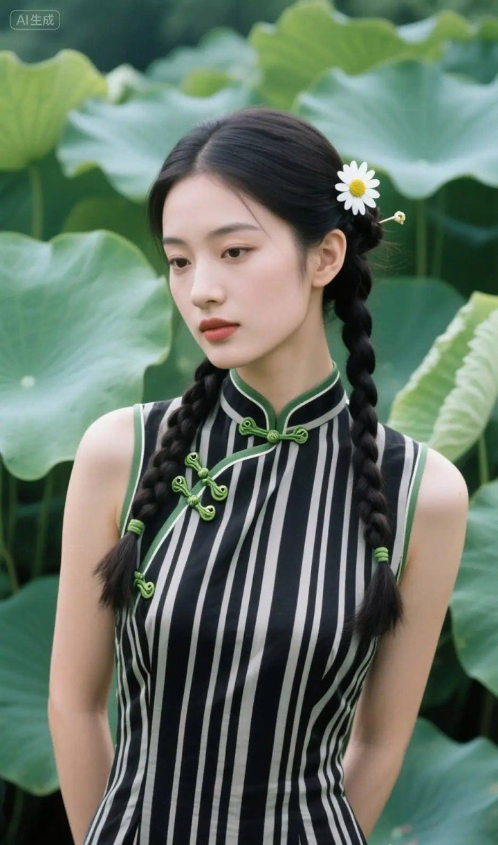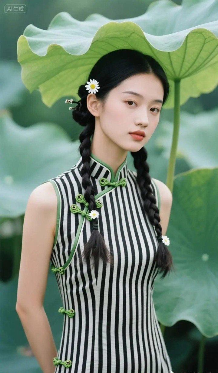 > 穿黑白条纹旗袍的女孩